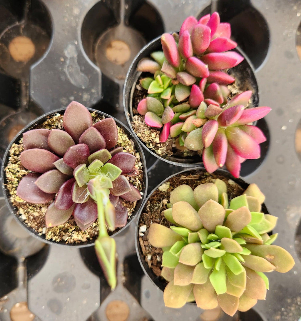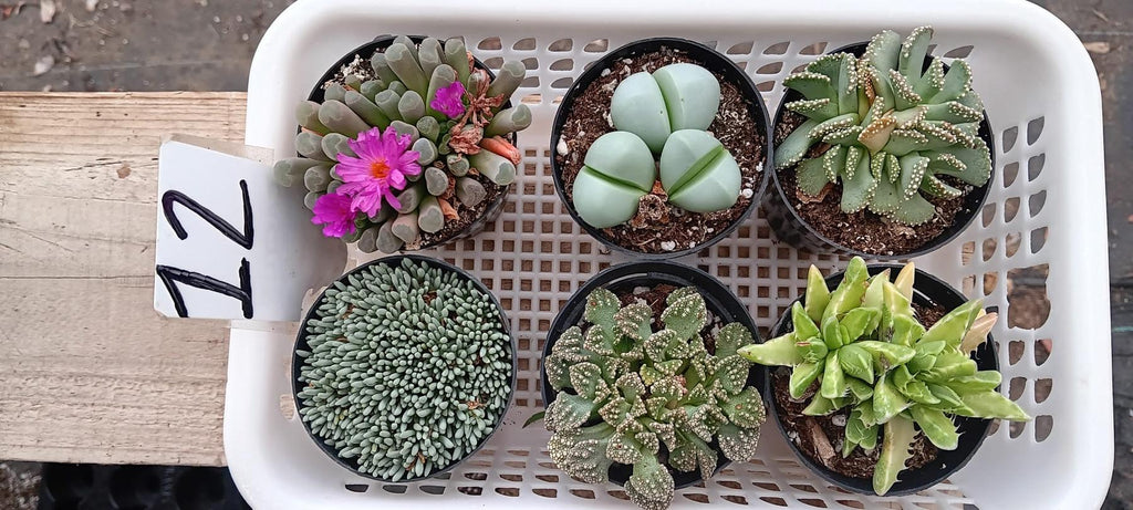 Lithops aka Living Stones, collection of individual lithops, they come in a 2.5″ plastic container usually containing 2-4 lithops in each container, but sometimes/rarely only 1 very larger and mature one, based on stock, size and other factors. Sometimes we also ship them in plastic square 2" containers, they will have multiples as well. Sizes and colors of lithops vary based on current stock and season!!! Please note that 99% of lithops are browns and grays. Other colors are a rarity. If you are looking for a large variety of colors, please email first as we cannot guarantee the colors we have in stock.