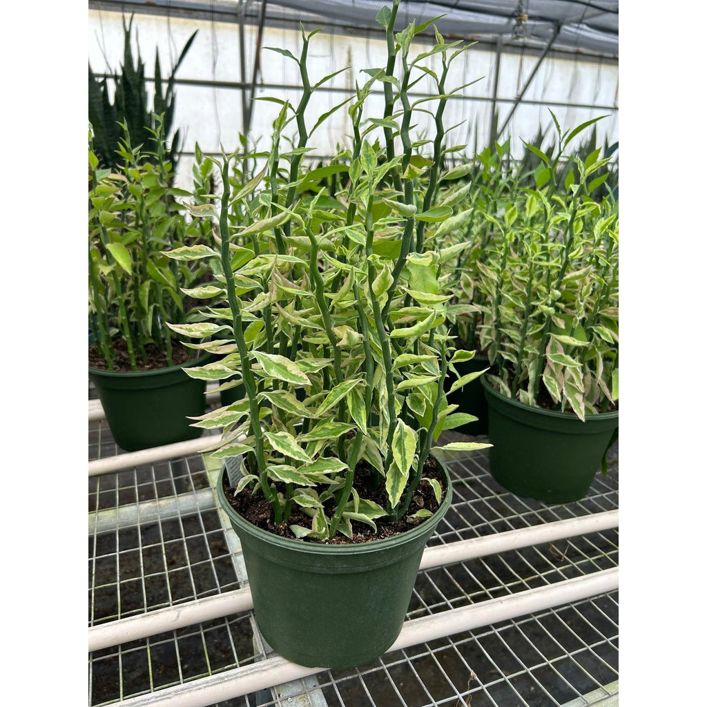• Description: Delightfully crooked, zig-zag stems give Variegated Devil‚Äôs Backbone its wild, rebellious look and playful nickname. Variegation in shades of chartreuse, yellow and cream highlight the edges of the small, pointed leaves, adding extra appeal to its exotic form. In the cooler winter months, the leaf edges can take on a pink hue. This colorful, succulent shrub makes a uniquely sculptural houseplant specimen. Also called Jacob‚Äôs Ladder, or Redbird Flower, the plant can develop tiny red flowers on the growing tips in spring, however they often don‚Äôt bloom in cultivation. Grow in a well-draining, light potting mix, and avoid extended periods of extreme dryness, which can cause leaf drop.