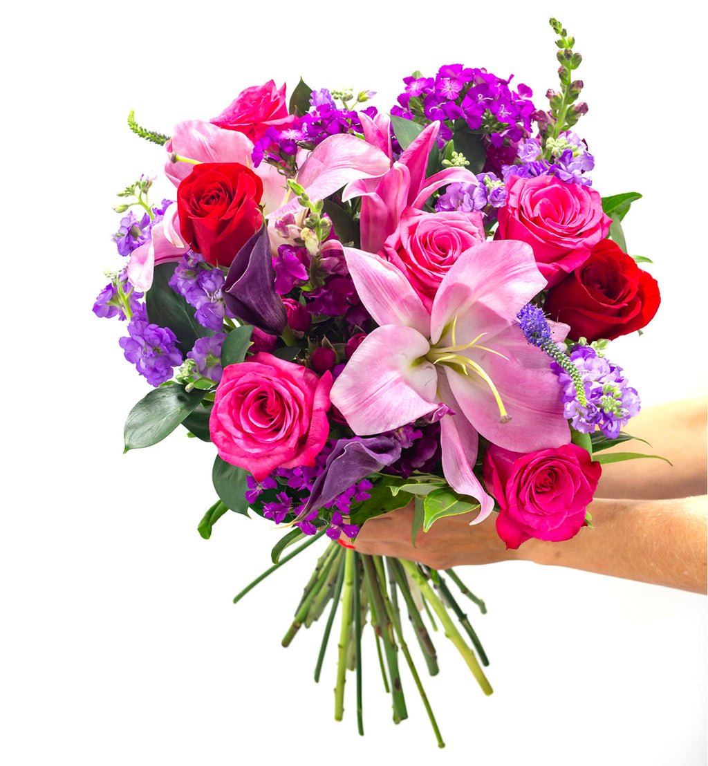 Let love flow freely with the Breeze of Love bouquet. This lush, romantic arrangement pairs elegant lilies with classic pink and red roses, symbolizing devotion and admiration. Rich purple mini callas add a touch of drama, while snapdragons, stock, and airy veronica bring movement, texture, and soft fragrance. Designed with layered blooms and vibrant color, the Breeze of Love bouquet captures the feeling of love in full bloom—perfect for anniversaries, romantic gestures, or any moment meant to be remembered.