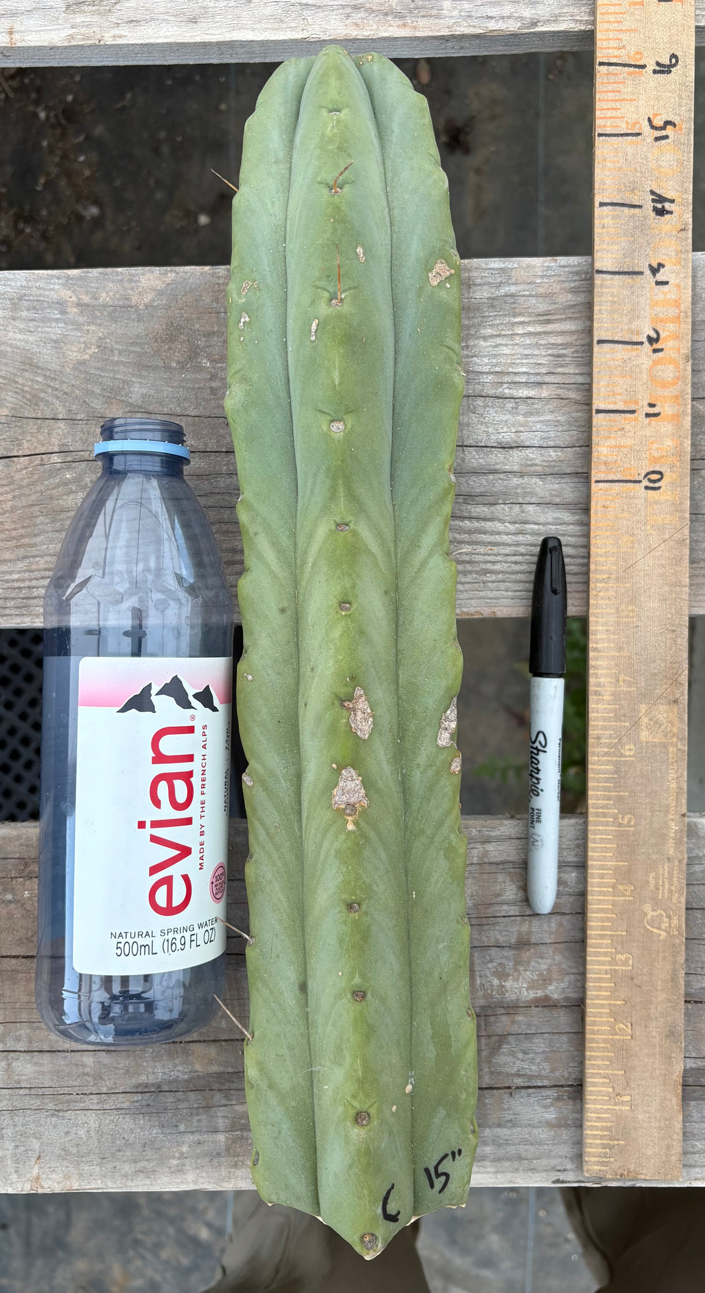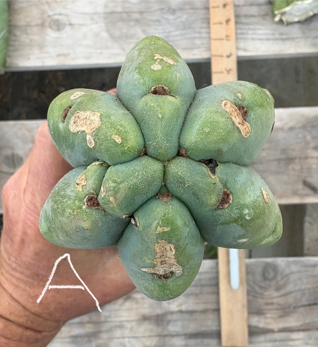 Trichocereus Bridgesii Jiimz Twin Spine Cactus cuttings for sale here. Jiimz is an umbrella name for a variety of different Bridgesiis growing here at the nursery. Collected and propagated, Twin Spines is a specific specimen that tends to have minimal spines up top, and often two distinctive and thick spines lower down. Hands down one of my favorite trichocereus growing here, they can show beautiful blue and gray hues, really a unique clone that deserves a place in any trich collection. Cut and dry and ready for you to pot and root, cuttings may be segmented which simply means there are 2 or more segments in the cutting. When a cactus is cut, a new tip forms. See picture that says segmented.