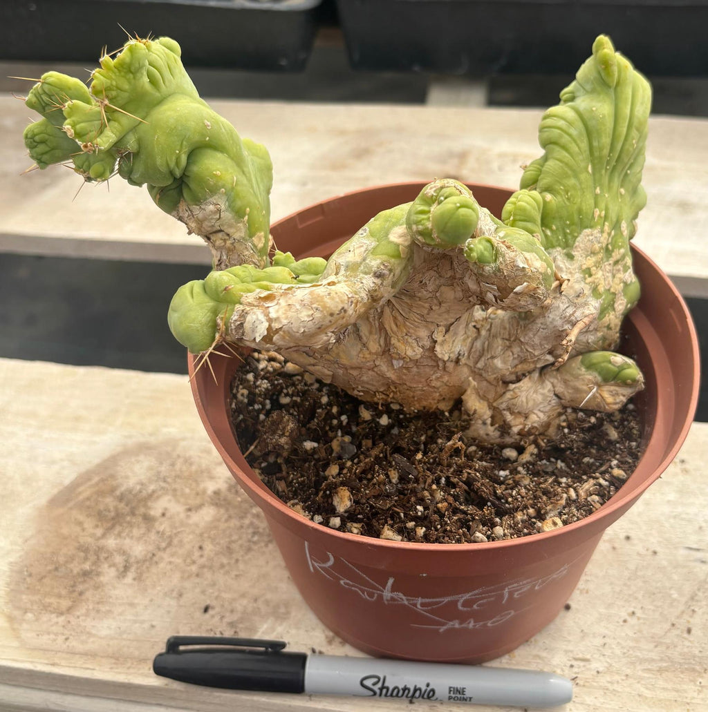 Trichocereus Bridgesii monstrose crest cactus specimen potted in a 1 gallon plastic container.  Very ready for a new and larger container, these guys grow much faster when up-potted with fresh soil.