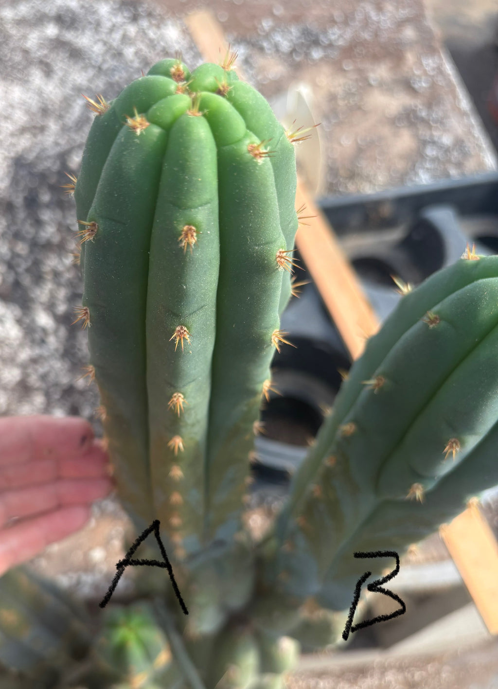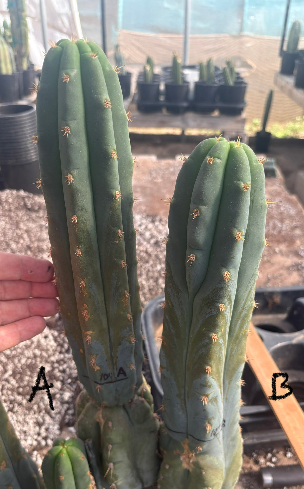 Both cuttings, A and B are approx 10” and will be cut below the line in each picture. B is slightly thicker and has a few scars on the backside. These have been growing in a greenhouse in a large 10 gallon container, these are named Jiimz Huanu/Jiimz Big Macs/P7, a beautiful cactus,  ready to be rooted, potted and added to your collection.