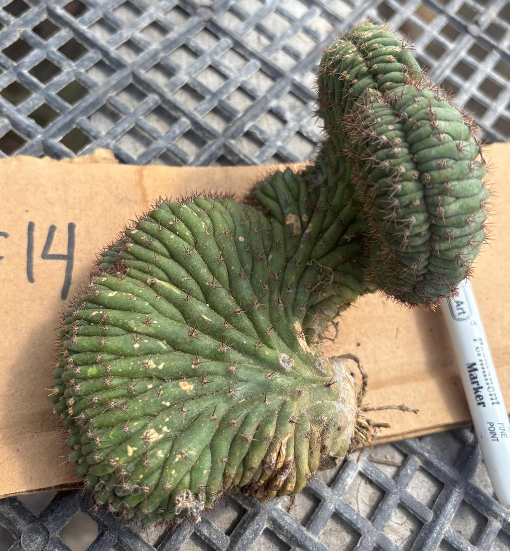 Trichocereus Pachanoi  Variegated Crested cactus specimen. These are called bi-lateral variegation per one side is often void of any chlorophyll, chlorophyll is needed to photosynthesize, thus creat energy for growth.  Sometimes there's a blend of both on these  guys.  Your turn to take over and let grow, ready for some fresh soil and a new home.