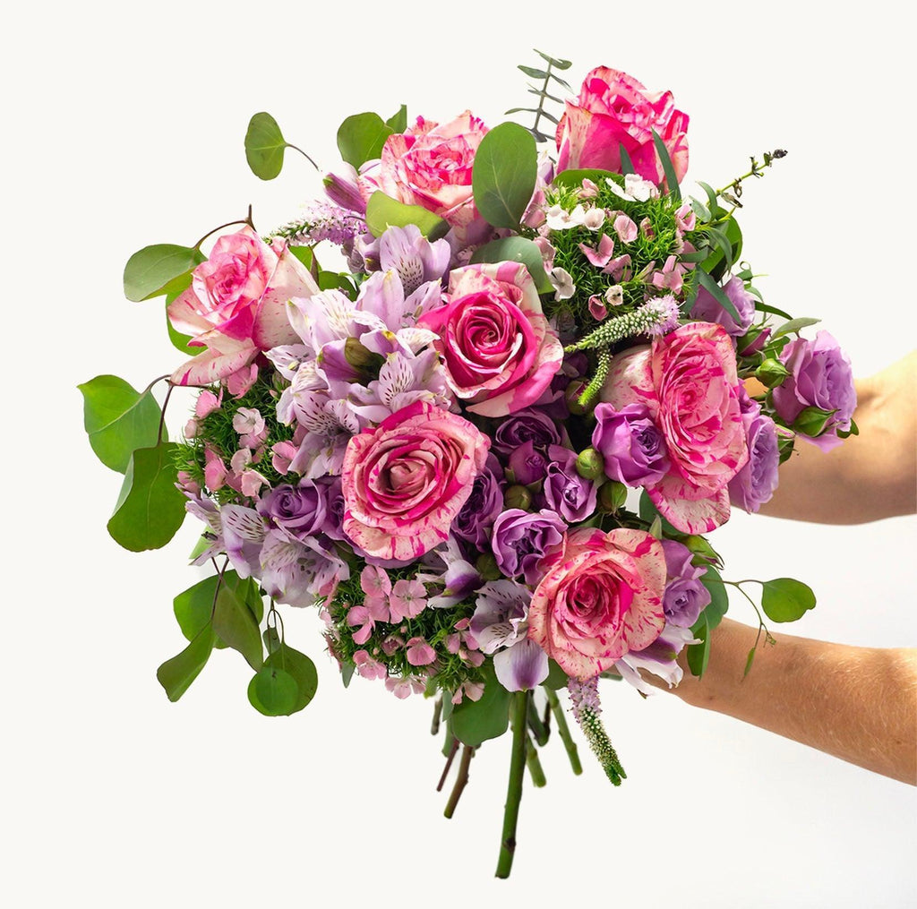 Make your own personal fairytale a reality with our Ever Thine bouquet. This romantic assortment of striking bicolor pink and white roses, lavender spray roses and alstroemeria, and pink veronica and dianthus sweet williams is a stunning way to let someone you know you love them. Show your devotion with a surprise delivery of these beautiful blooms for your next special occasion!