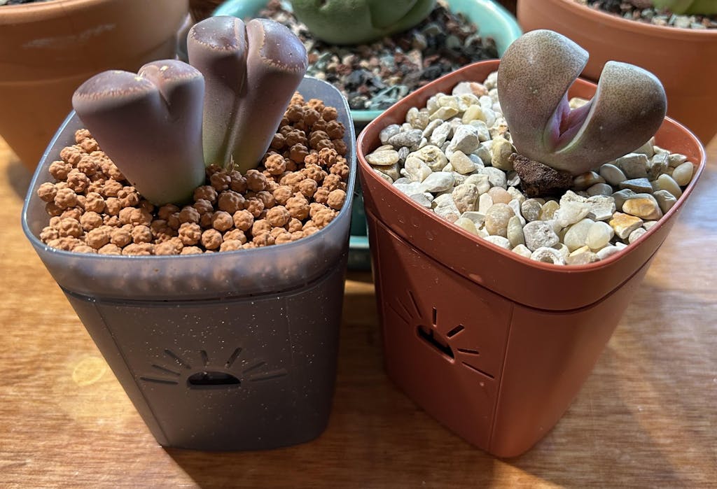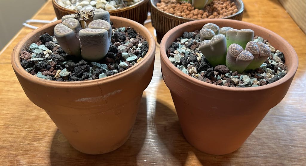 Watering: Please Note: Lithops are NOT a type of "Water When Dry" plant. DO NOT WATER WHEN THEY ARE SPLITTING WITH NEW Lithops on their middle*