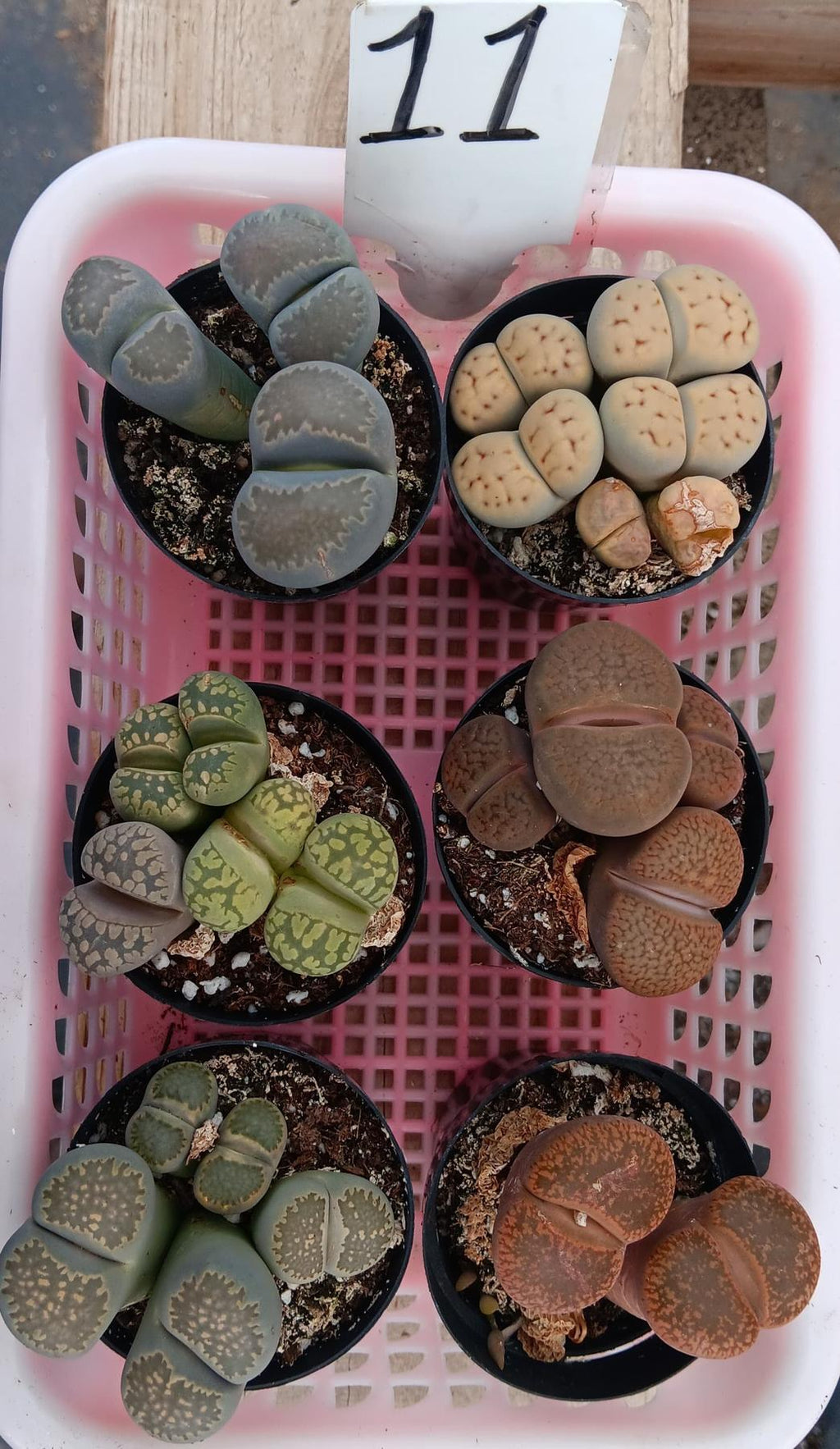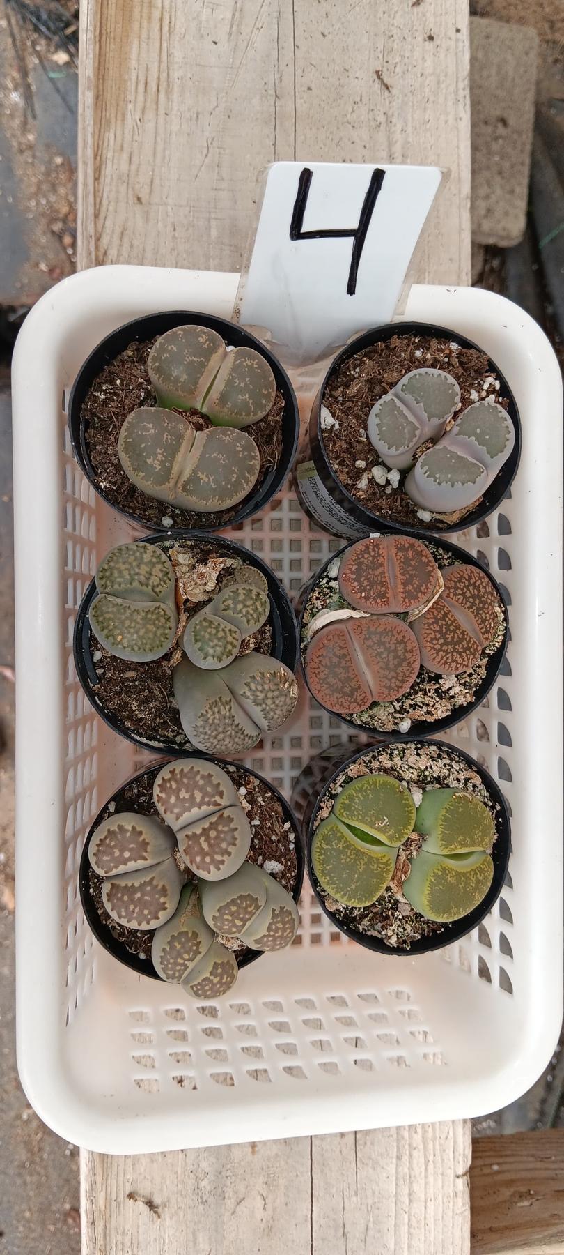 Lithops aka Living Stones, collection of individual lithops, they come in a 2.5″ plastic container usually containing 2-4 lithops in each container, but sometimes/rarely only 1 very larger and mature one, based on stock, size and other factors. Sometimes we also ship them in plastic square 2" containers, they will have multiples as well. Sizes and colors of lithops vary based on current stock and season!!! Please note that 99% of lithops are browns and grays. Other colors are a rarity. If you are looking for a large variety of colors, please email first as we cannot guarantee the colors we have in stock.