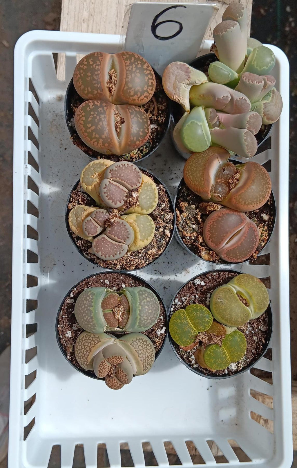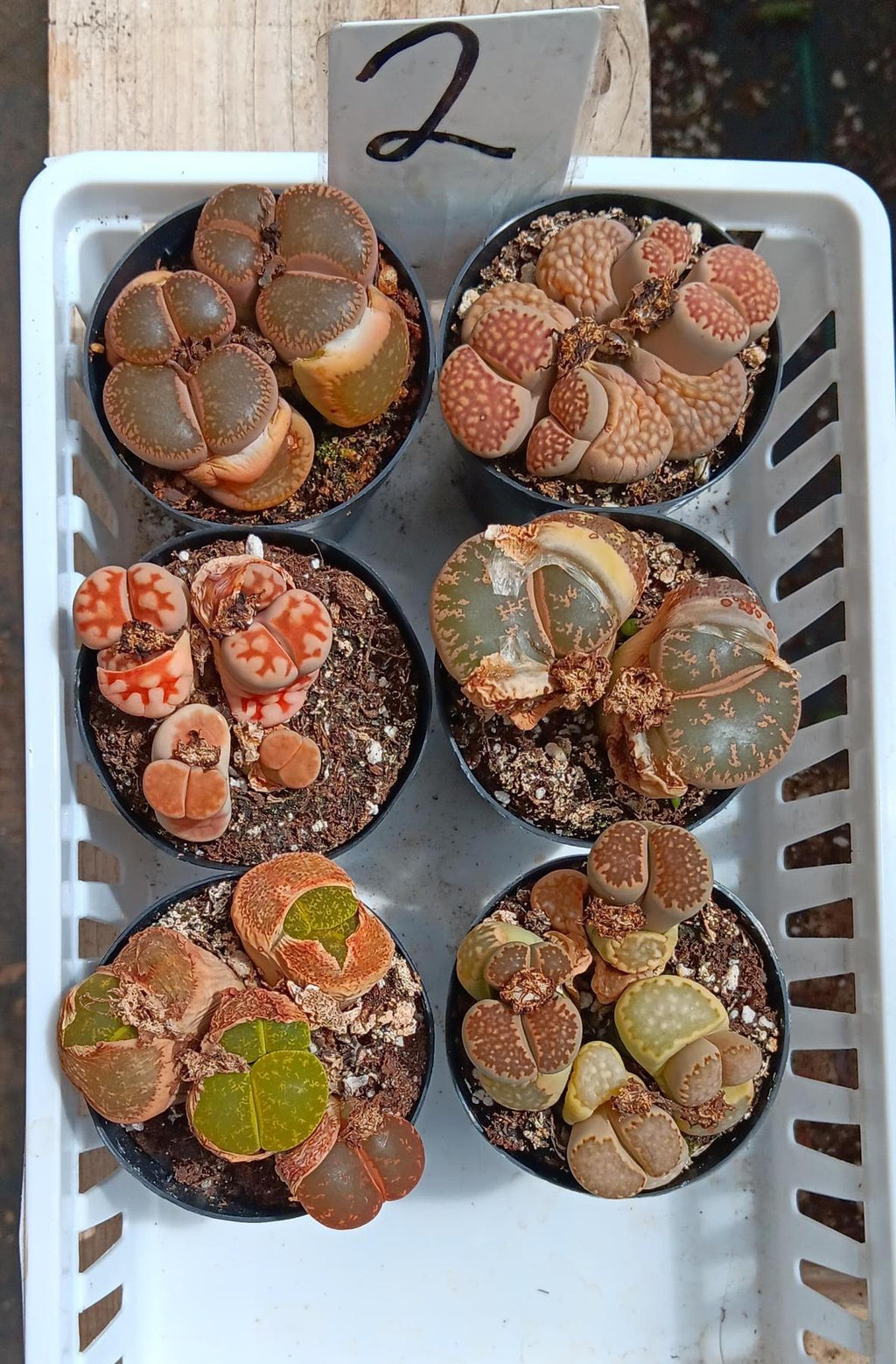 Lithops aka Living Stones, collection of individual lithops, they come in a 2.5″ plastic container usually containing 2-4 lithops in each container, but sometimes/rarely only 1 very larger and mature one, based on stock, size and other factors. Sometimes we also ship them in plastic square 2" containers, they will have multiples as well. Sizes and colors of lithops vary based on current stock and season!!! Please note that 99% of lithops are browns and grays. Other colors are a rarity. If you are looking for a large variety of colors, please email first as we cannot guarantee the colors we have in stock.