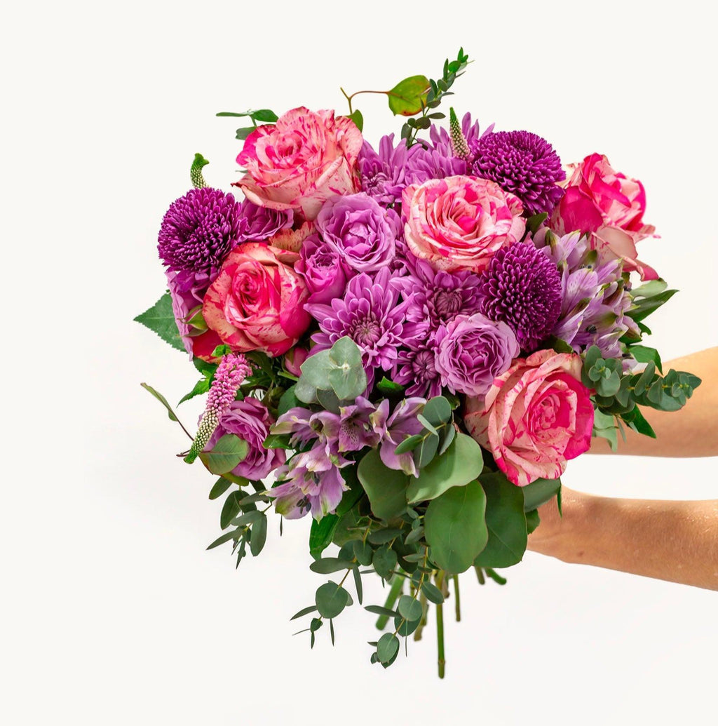 Our "Vineyard Blush" bouquet captures the romantic and understated charm of a summer winery. This consciously curated arrangement exudes rustic elegance, with a dreamy blend of blush and wine-toned blooms. Delicate pink and subtly variegated roses intertwine with the unique texture of deep purple allium and the airy grace of lavender veronica. Touches of eucalyptus and other natural greenery add a hint of wild beauty, reminiscent of the vines themselves. Whether you’re cheers-ing to a birthday, anniversary, or treating yourself, indulge in the charm of this bouquet today!